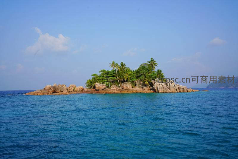 一座被碧蓝海水环绕的热带小岛,岛上棕榈树成荫,岩石嶙峋,远处山峦隐约,是理想的度假天堂。