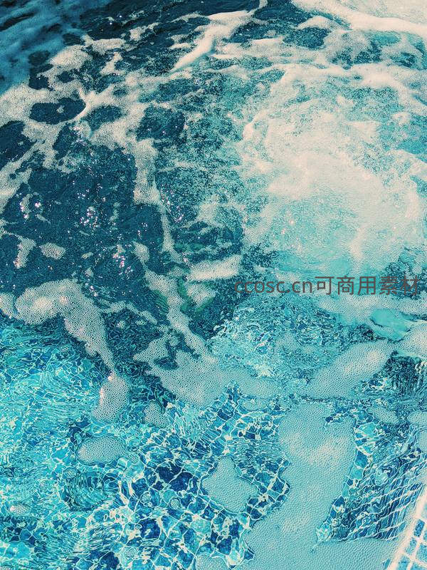 俯拍视角下,泳池水面泛起层层涟漪与白色泡沫,阳光穿透清澈的蓝绿色水体,形成梦幻般的光影效果。
