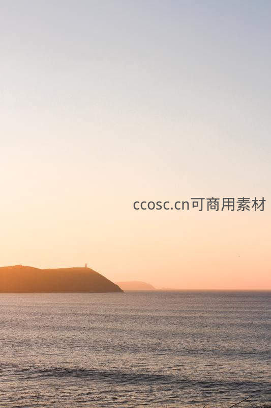 夕阳余晖将天空染成柔和的橙粉色,远处海岬化作深色剪影,顶端灯塔隐约可见,海面平静,氛围宁静祥和。