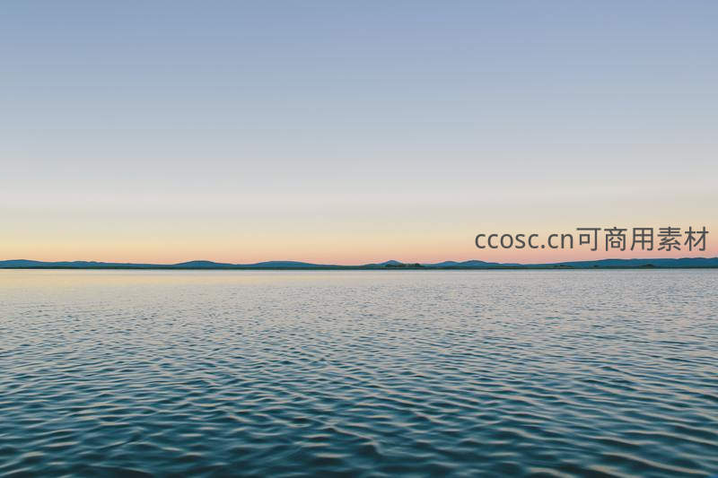 平静湖面倒映着渐变的暮色天空与连绵远山,水天一色,营造出辽阔而安宁的黄昏自然画卷。