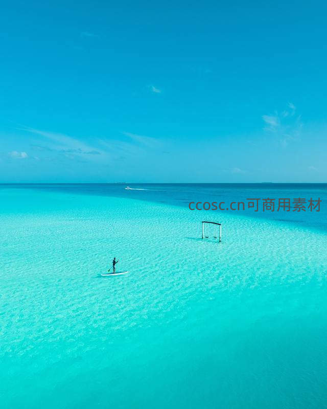 在一片如梦似幻的浅蓝色海域中,一人独自站立桨板之上,远处小船划破平静,尽显自由与宁静。