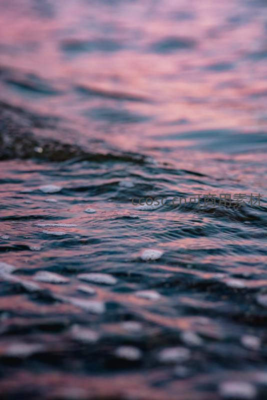 黄昏时分,粉紫色的天光温柔地铺满水波表面,细腻的涟漪承载着光斑与泡沫,仿佛一幅流动的油画,弥漫着浪漫唯美的氛围。