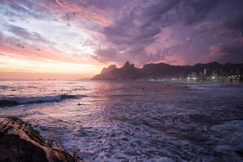 夕阳将天空染成梦幻紫粉色调,海浪轻拍沙滩,远处山峦与城市灯火交相辉映,构成一幅壮丽的海滨黄昏画卷。
