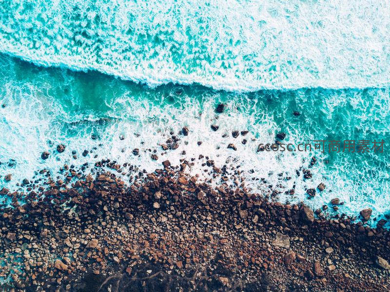 从高空俯瞰,碧蓝海水与白色浪花激烈碰撞在深色礁石上,展现出大自然原始而壮丽的力量与美感。
