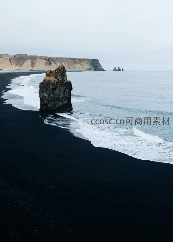 独特的黑色沙滩上矗立着一块巨大海蚀柱,远处是连绵的悬崖和开阔的海面,构成一幅静谧而神秘的自然画卷。