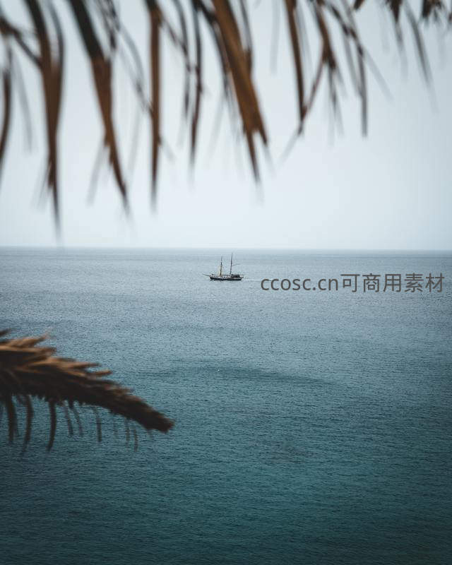 透过摇曳的棕榈叶缝隙,一艘小帆船在广阔无垠的蔚蓝海面上缓缓航行,营造出悠闲惬意的热带度假氛围。
