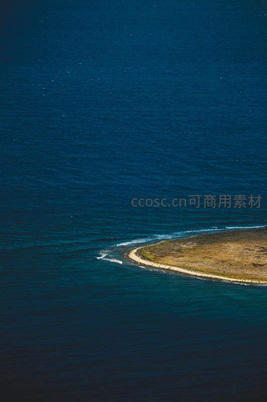 从高空俯瞰,一片狭长的陆地伸入深邃的蓝色海洋,洁白的沙滩与深蓝海水形成鲜明对比,尽显自然之美。