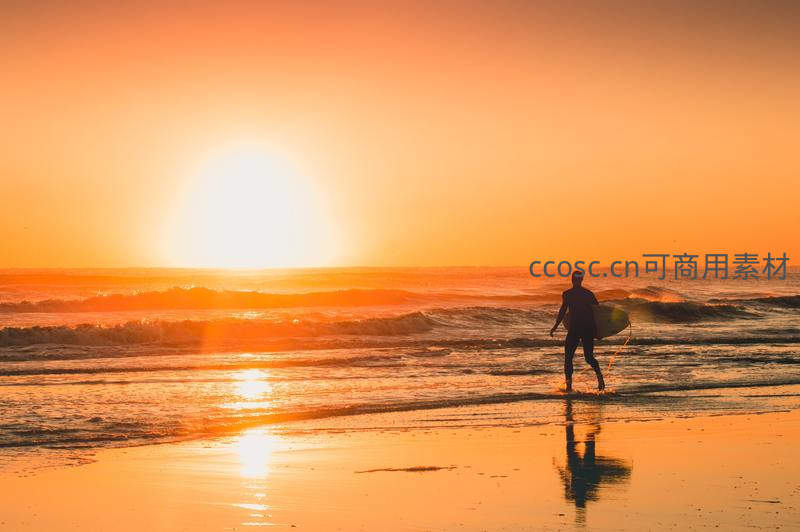 一名冲浪者在绚烂的夕阳下走向大海,金色的阳光洒满海面,波光粼粼,营造出宁静而充满活力的氛围。