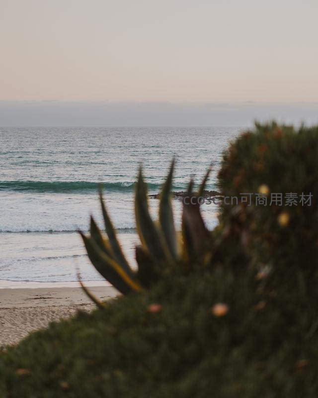 前景是模糊的绿色植物,背景是波光粼粼的大海和柔和的日落余晖,展现了海边宁静而富有层次感的自然风光。