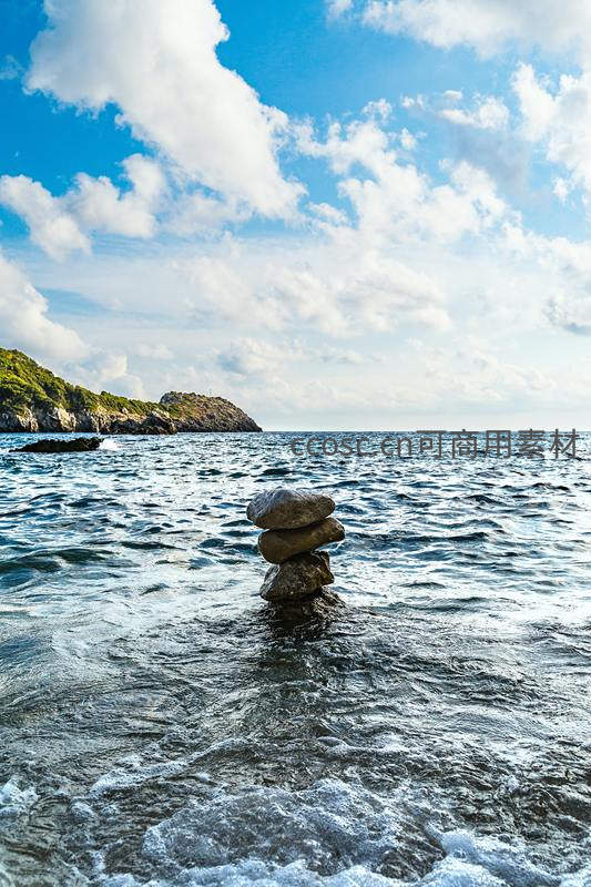 几块石头在浅海中被巧妙堆叠,形成一座小小的平衡雕塑,背景是广阔的蔚蓝天空与朵朵白云,意境悠远宁静。