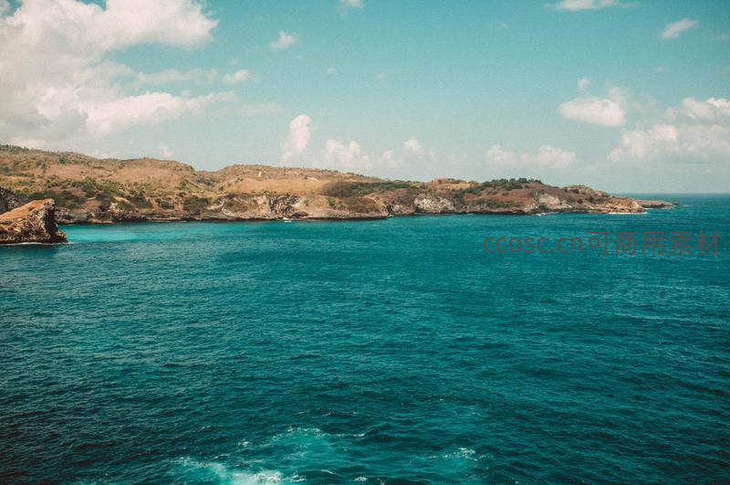 从高空俯瞰,湛蓝的海水温柔地环抱着一座植被覆盖的岛屿,天空澄澈,云朵悠闲,是理想的热带海岛度假胜地风光。
