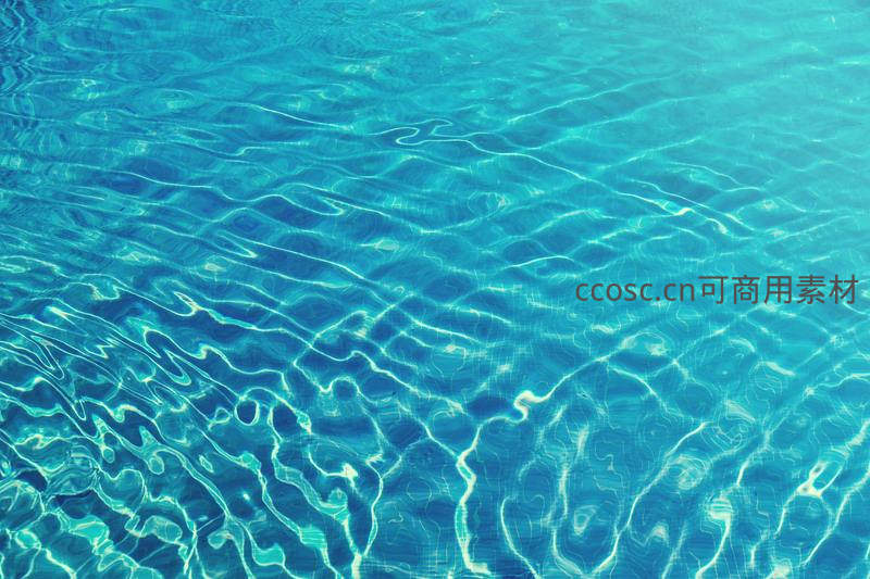 近距离拍摄清澈的水面,阳光穿透水体,在底部形成变幻莫测的光斑和涟漪,呈现出如梦似幻的蓝色调与流动的视觉纹理。