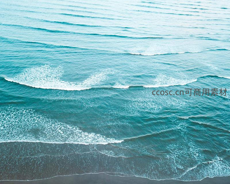 从高空俯瞰,层层叠叠的碧蓝色海浪温柔地拍打着深色沙滩,形成一幅宁静而壮阔的自然画卷。