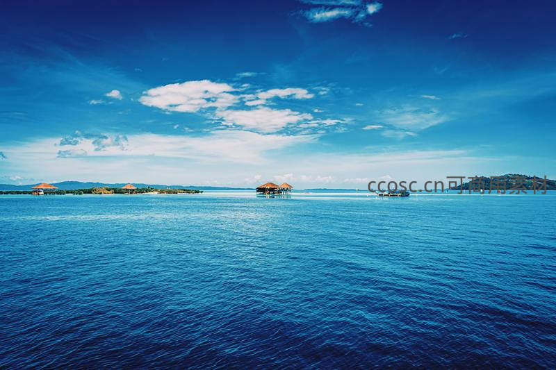 晴朗天空下,湛蓝的海面上点缀着几座热带风格的水上屋和远处的小岛,营造出完美的海岛度假氛围。