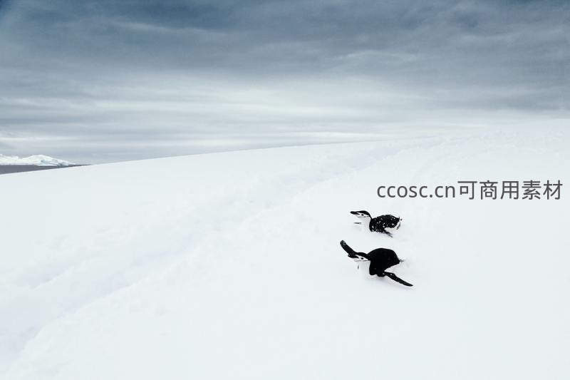 在广袤无垠的白色雪原上,两只黑白相间的企鹅正欢快地用肚子滑行,身后留下清晰的轨迹。