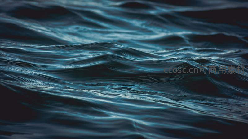 在昏暗光线下,深蓝色的海面波涛汹涌,层层叠叠的波浪反射着微弱的光芒,营造出一种神秘、深邃且充满力量的氛围。