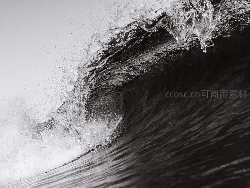 一张充满力量感的黑白照片,捕捉了巨浪卷起、水花飞溅的动态瞬间,展现了海洋的原始与壮阔。