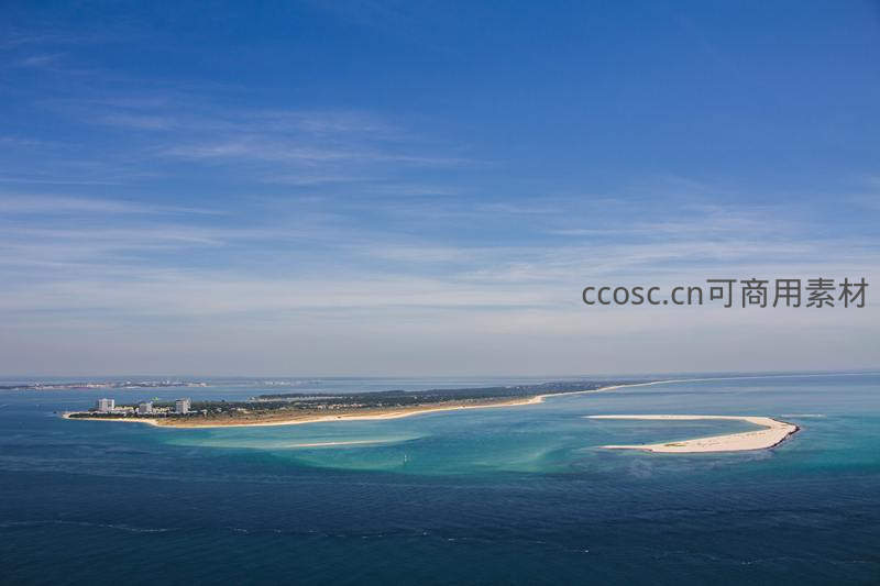 从空中俯瞰一座狭长的热带岛屿,洁白的沙滩与清澈的碧绿海水交相辉映,远处可见沿海建筑群。