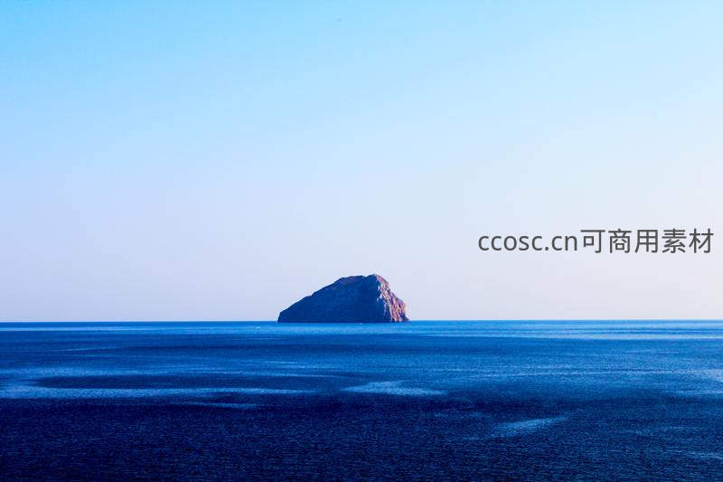 在广阔无垠的蓝色海面上,一座孤零零的小岛矗立于地平线处,简洁的构图带来一种宁静而深远的意境。