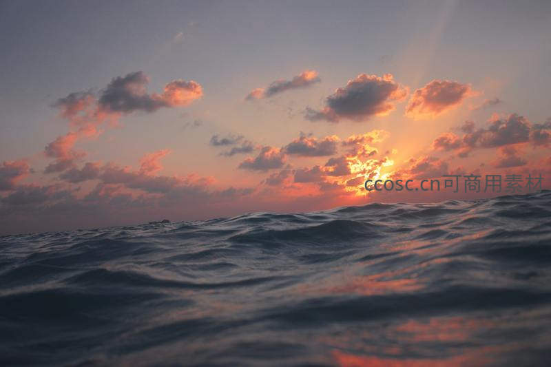 夕阳西下,橙红色的霞光洒满天空和海面,层层波浪轻柔起伏,倒映着绚烂的晚霞,画面温柔而浪漫。