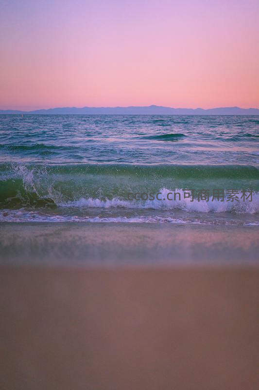 夕阳将天空染成梦幻粉紫,海浪温柔卷起白色泡沫,缓缓漫过湿润沙滩,营造出静谧而浪漫的黄昏海滨氛围。