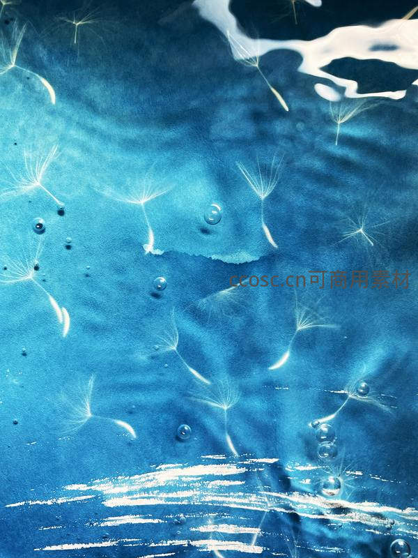 水下蒲公英种子在蓝色光影中漂浮,气泡环绕,营造出超现实的梦幻氛围和细腻的艺术质感。