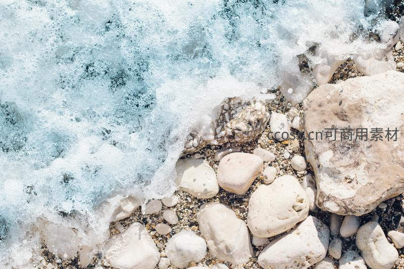 清澈的海水冲击着岸边的白色鹅卵石,激起层层白色浪花,展现了海洋与陆地交界处充满活力的瞬间和细腻的质感。