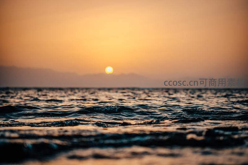 一轮金黄的太阳悬于远方山脉之上,余晖洒在起伏的海面上,波光粼粼,天地间一片静谧,尽显大自然的壮阔与温柔。