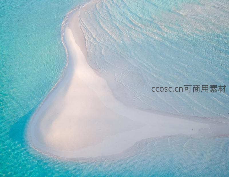 空中俯瞰一弯心形白沙洲,被清澈碧蓝海水温柔环绕,宛如大自然精心雕琢的浪漫画卷,令人心驰神往。