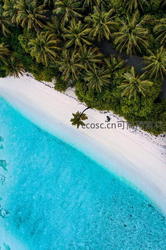 从高空俯瞰热带海岛,洁白沙滩与翠绿椰林相接,碧蓝海水如宝石般闪耀,尽显人间天堂的度假风情。
