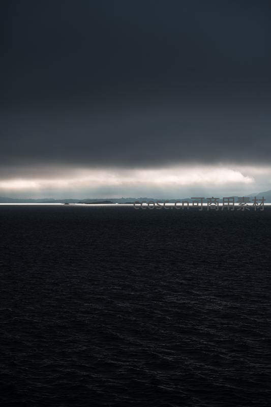 阴云密布的海天一线,远方岛屿若隐若现