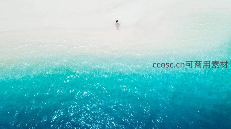 从高空俯视,一个渺小的人影独自坐在纯净的白色沙滩上,面对着渐变的蔚蓝海水,画面简洁而富有诗意,传递出极致的宁静与自由。