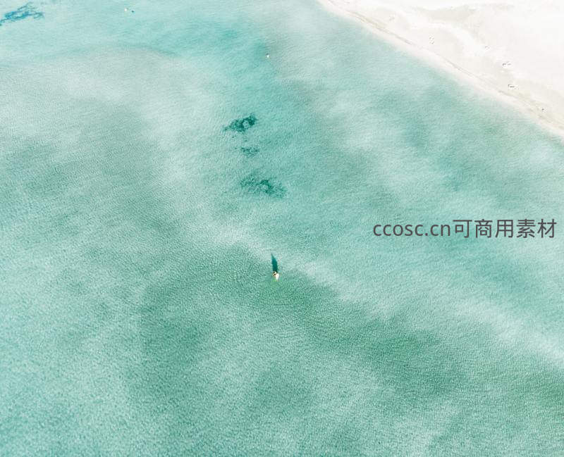 从高空俯瞰,一人独自伫立于浅滩碧水中,四周是无垠的清澈海域与洁白沙滩,画面空灵静谧,传递出远离尘嚣的孤独美感。