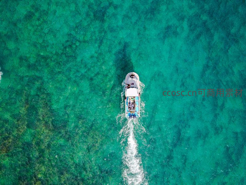 一艘快艇在清澈碧蓝的海面上疾驰,身后留下一道醒目的白色水痕,充满动感与活力。