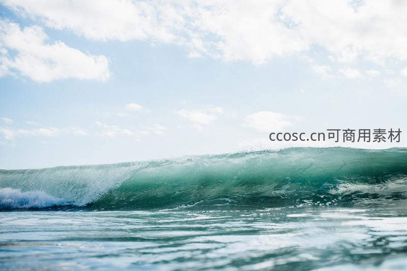 一道巨大的碧绿色海浪正要拍打下来,天空湛蓝白云朵朵,展现了大海的壮阔与天空的辽远。