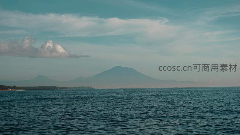 蔚蓝的大海与远方连绵的黛青色山脉相接,头顶是飘着薄云的晴朗天空,构成一幅开阔而宁静的海景图。