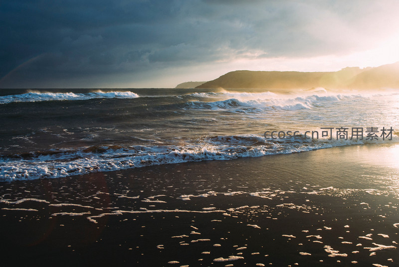 乌云压顶的风暴天气中,金色夕阳穿透云层洒在黑色沙滩上,海浪汹涌,远方一道彩虹若隐若现,景象壮丽而富有戏剧张力。
