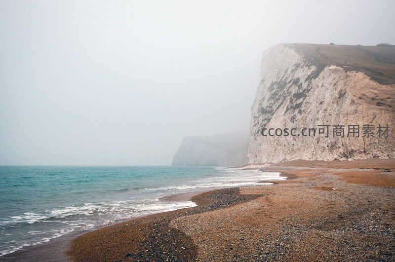 浓雾笼罩着高耸的白色悬崖,碧蓝海水温柔拍打着岸边的卵石滩,营造出一种神秘而宁静的氛围。