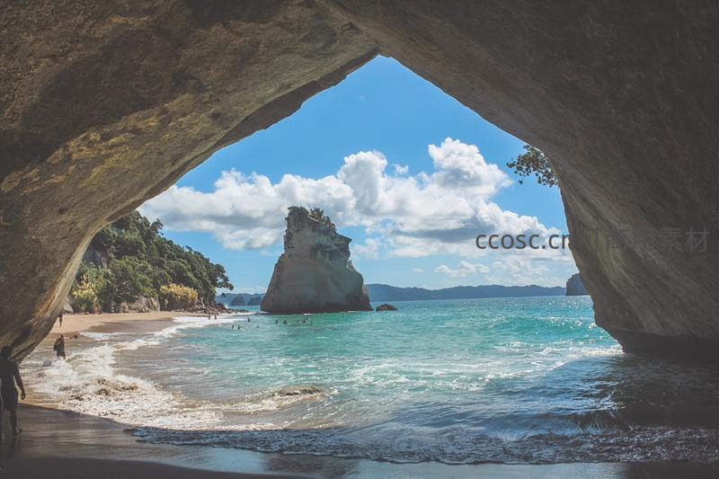 通过巨大的天然岩石拱门,可以看到外面碧波荡漾的海洋、远处的独立奇岩和悠闲的游客,景色壮丽而独特。