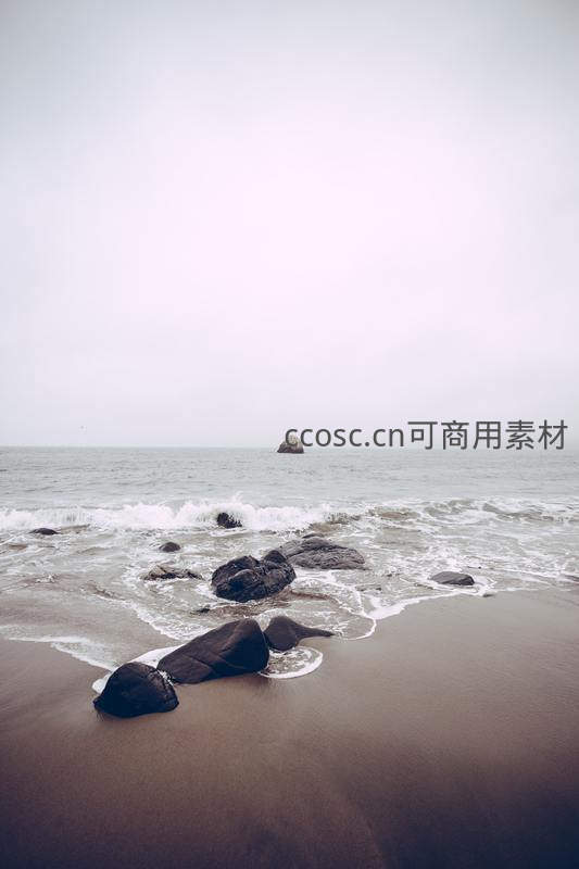 薄雾笼罩的海岸线,几块黑色礁石散落沙滩与浅水区,远处海面孤石若隐若现,营造出静谧而神秘的氛围。