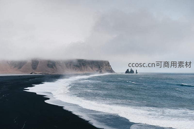 标志性的黑色火山沙海岸延伸至远方,白浪轻抚,云雾低垂笼罩着陡峭悬崖,远处海中矗立着奇特岩柱,景象壮丽而苍凉。