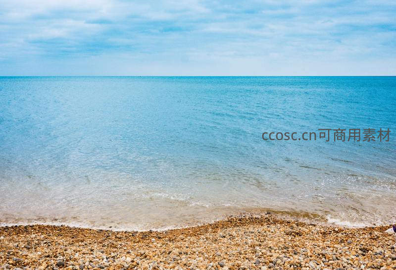 阳光明媚下,由大小不一的鹅卵石铺成的海滩温柔地迎接清澈见底的碧蓝色海水,天空湛蓝,是理想的海滨度假场景。