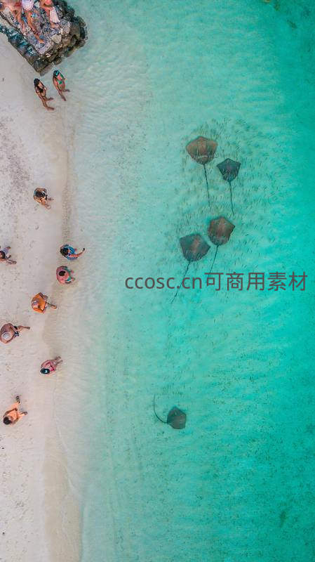 航拍视角,游客与鳐鱼共舞碧海白沙间