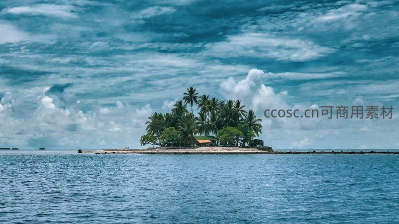 一座被茂密椰林覆盖的小岛,中央点缀着茅草小屋,四周碧波荡漾,天空云彩变幻,充满热带风情。