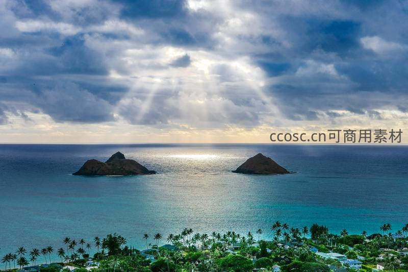 阳光穿透厚重云层,如金光般洒落在海面上和远处的双子火山岛上,前景是郁郁葱葱的热带植被。