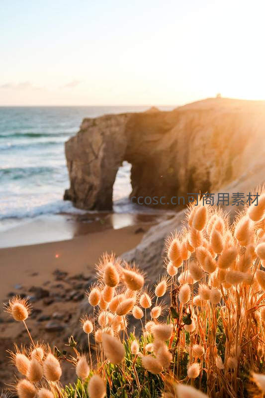 前景毛茸茸的野花在夕照中金黄闪耀,背景是被阳光染成暖色的天然岩石拱门,海浪轻拍沙滩。