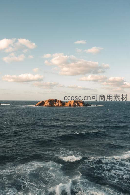 在金色夕阳的映照下,一座孤独的岩石小岛屹立于波涛汹涌的海面,远方天际线柔和,充满诗意与力量。