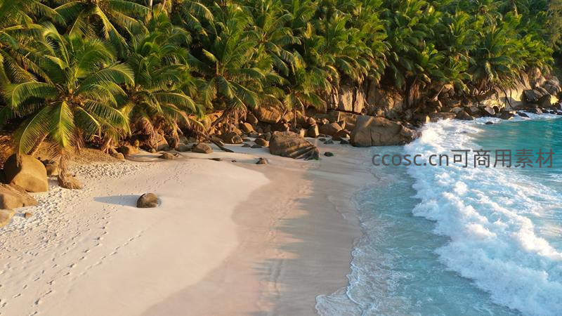 洁白的沙滩旁,成排的椰子树在微风中摇曳,碧蓝的海水卷起白色浪花,构成一幅典型的热带海岛风情画。