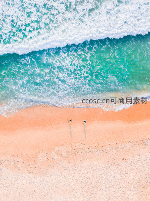 从高空俯瞰,一对情侣在橙色沙滩上留下足迹,身后是翻滚的白色浪花与碧绿海水,画面充满浪漫与宁静的度假氛围。