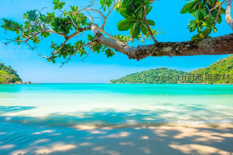 树影婆娑下的碧海蓝天,静谧海湾如画